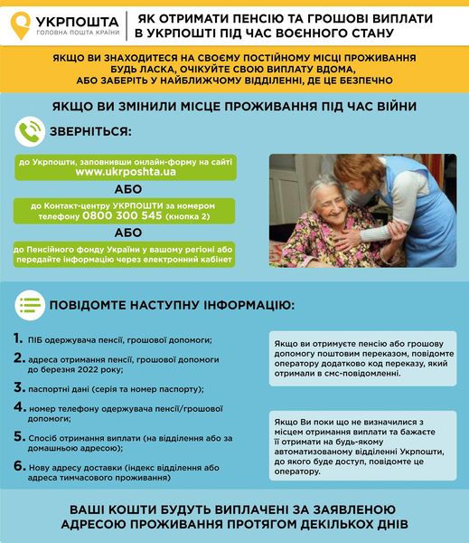 Якщо пенсіонер, що отримував пенсію у відділенні поштового зв’язку змінив місце проживання, він може отримувати пенсію за місцем фактичного проживання. Для цього треба зателефонувати на номер гарячої лінії пенсійного фонду й залишити відповідну заявку. Детальніше інформує “Укрпошта”: