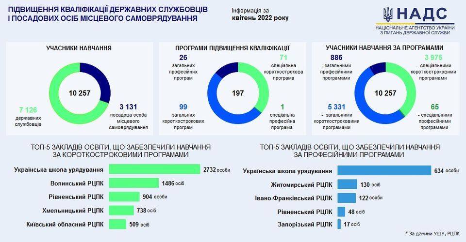 Упродовж квітня 10 257 державних службовців та посадових осіб місцевого самоврядування пройшли навчання в Українській школі урядування та регіональних центрах підвищення кваліфікації (РЦПК) за 197 програмами підвищення кваліфікації.