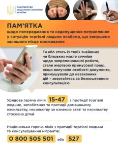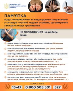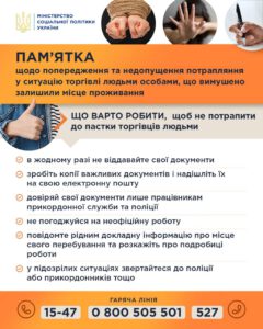 Як у період війни уникнути загрози потрапляння до сучасного рабства❓ by Anna · 15.06.2022 Під час війни, при евакуації та перетинанні кордону, Ви можете опинитись під загрозою потрапляння до сучасного рабства. Міністерство соціальної політики у співпраці з партнерами розробили «Пам’ятку» щоб запобігти потраплянню у ситуації торгівлі людьми.