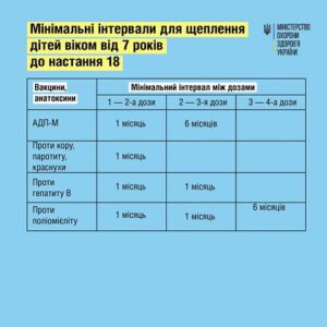 Мінімальний інтервал – інтервал, який допускається до введення вакцини проти однієї й тієї самої інфекції з порушенням календаря. Введення чергової дози вакцини з меншим інтервалом не зараховується. Схему вакцинації можна знайти в інструкції до вакцини.