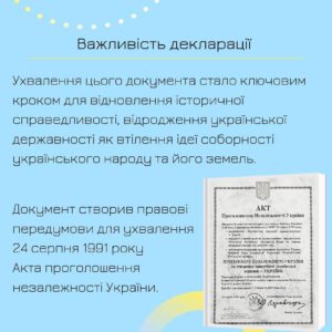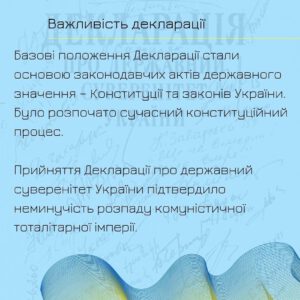 ? Документ проголосив суверенітет України як верховенство, самостійність, повноту і неподільність влади республіки в межах її території, незалежність і рівноправність у зовнішніх відносинах. Декларація стала важливим кроком на шляху до незалежності.