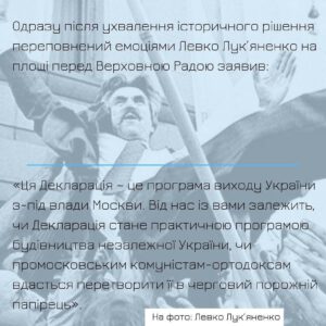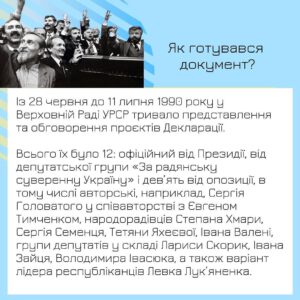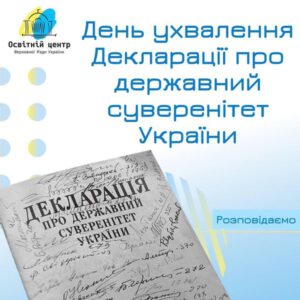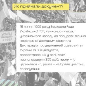 ?16 липня 1990 року Верховна Рада Української РСР, «виконуючи волю українського народу до побудови вільної незалежної держави», схвалила Декларацію про державний суверенітет України.