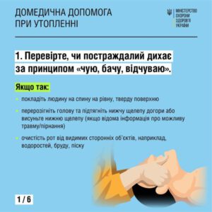 Переконайтеся, що порятунок інших не зашкодить вам самим – не ризикуйте власним життям. Покличте на допомогу. Якщо людина, яку витягли з води, не реагує на вас, викличне екстрену медичну допомогу за номером 103 та: