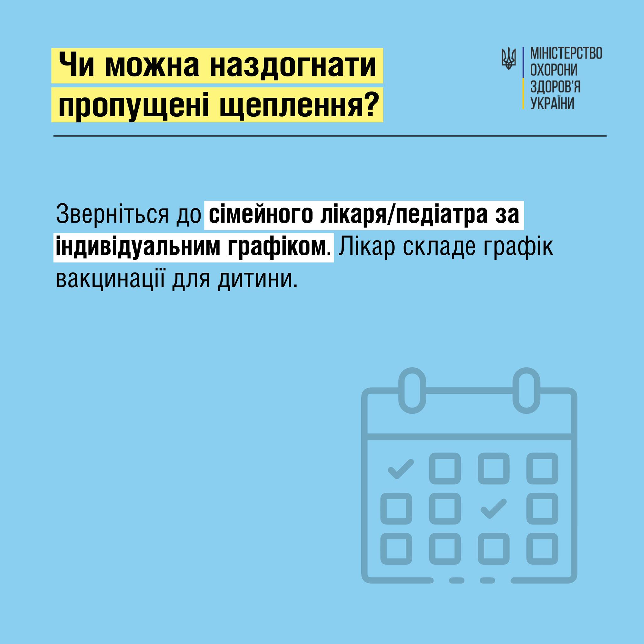 Якщо ви пропустили щеплення дитини за графіком – надолужте їх якомога швидше.