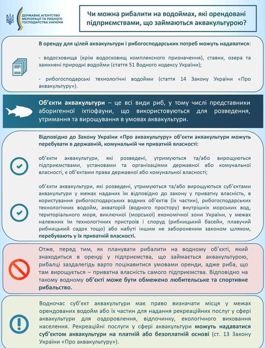 Отже, перед тим, як планувати рибалити на водному об’єкті, який знаходиться в оренді у підприємства, що займається аквакультурою, рибалці заздалегідь варто поцікавитися умовами оренди, адже риба, що там вирощується – приватна власність самого підприємства. Відповідно на такому водному об’єкті може бути обмежено любительське та спортивне рибальство. Водночас суб’єкт аквакультури має право визначати місця у межах орендованих водойм або їх частин для надання рекреаційних послуг у сфері аквакультури для оздоровлення, відпочинку, екологічного виховання населення. Рекреаційні послуги у сфері аквакультури можуть надаватися суб’єктом аквакультури на платній або безоплатній основі (ст. 13 Закону України «Про аквакультуру»).