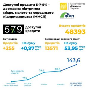 Усього з моменту старту Програми суб’єкти підприємництва станом на 10.10.2022 р. отримали від уповноважених банків 48 393 кредити на загальну суму 143,57 млрд гривень.
