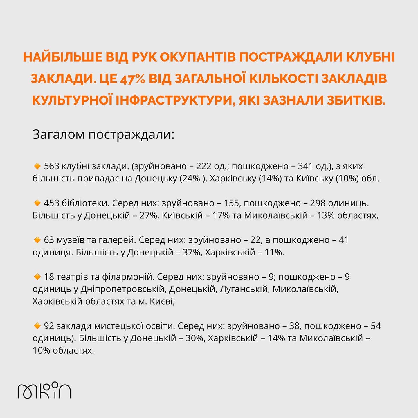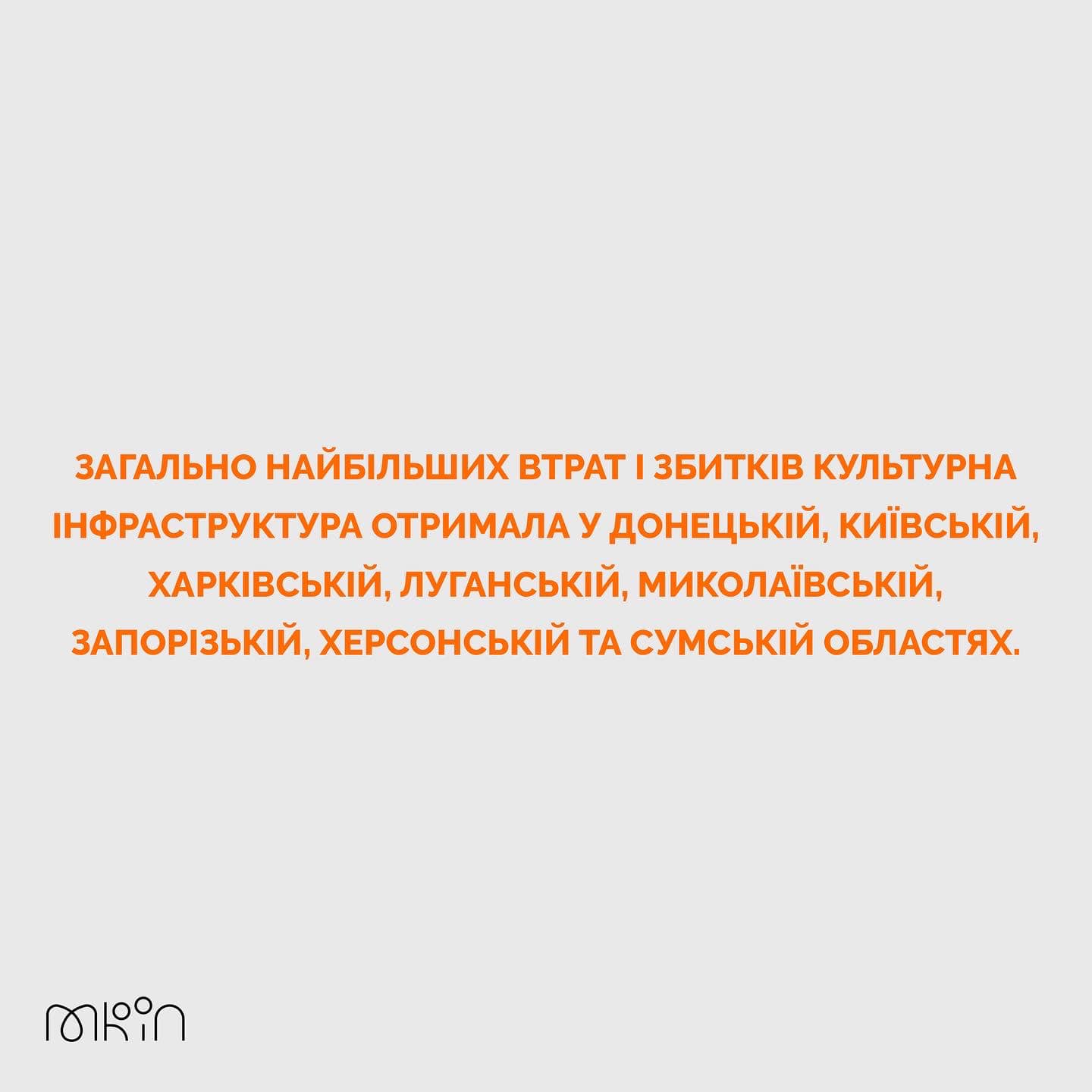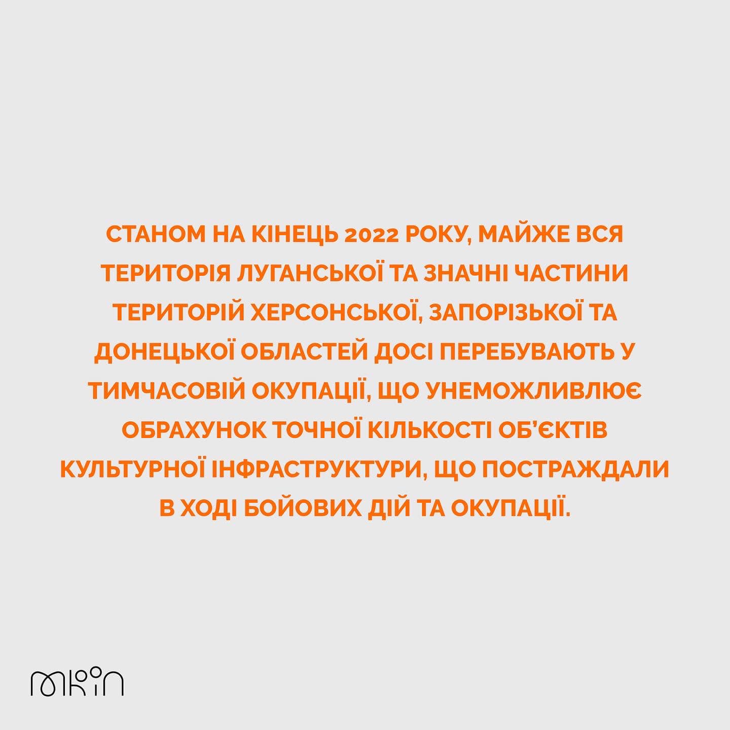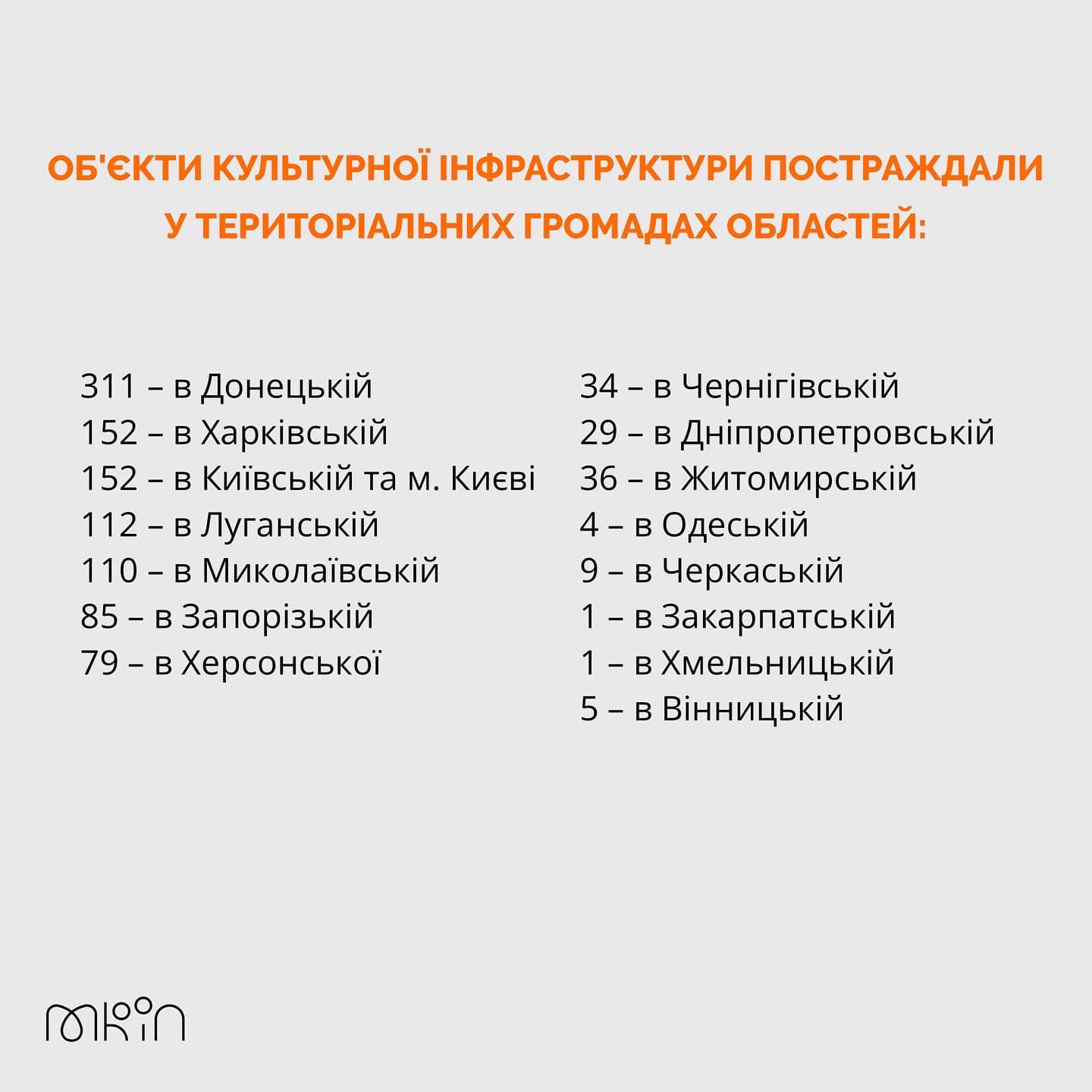 Станом на 25 грудня 2022 року, збитків зазнали 1189 об’єктів культурної інфраструктури. З них майже третина – 446 об’єктів повністю зруйновані.