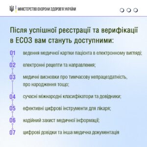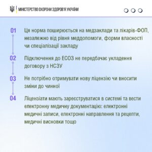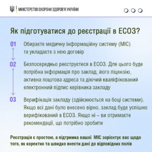 Усі заклади, а також фізичні особи-підприємці, які здійснюють медичну практику, згідно з актуальними вимогами законодавства, мають зареєструватися та вносити дані до електронної системи охорони здоровʼя (ЕСОЗ).