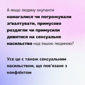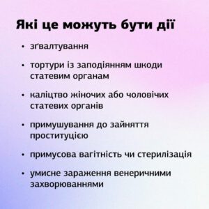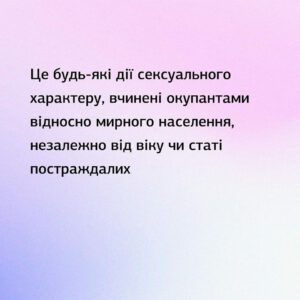 Пропонуємо ознайомитися з поняттям сексуального насильства в умовах конфлікту, оскільки воно не обмежується лише зґвалтуванням.