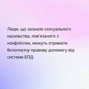 Люди, що зазнали сексуального насильства від окупантів, мають право на безоплатні послуги адвоката для представництва своїх інтересів під час досудового розслідування і у суді, складення документів процесуального характеру (позовних заяв, клопотань та заяв до суду) тощо.