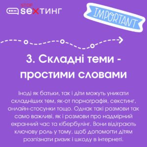 Батьки мають розуміти, що йдеться не лише про неконтрольований час онлайн, дезінформацію або надмірну увагу до трендів соцмереж. Сексуальне насильство є не тільки в офлайн-реальності, але й в інтернеті. Ці явища називають термінами: «секстинг», «онлайн-грумінг» та «сексторшен».