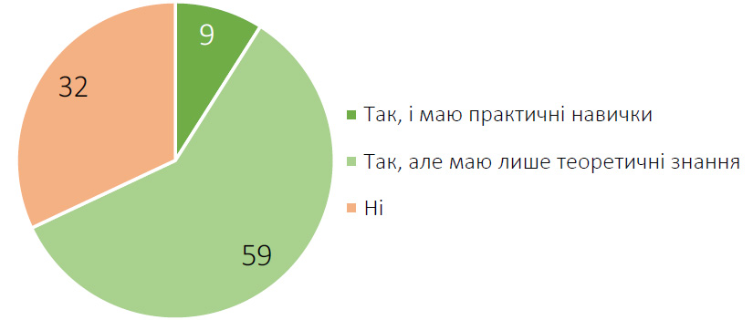 - Щодо потенційної можливості надання першої домедичної допомоги під час поранення, то тут варто зауважити, що херсонці скоріше не готові надати її за необхідності, через то, що більшість (59%) знає лише теоретично, що треба робити у таких випадках, а 32% взагалі не знає, що робити. Майже половина жителів міста не має необхідних засобів для надання такої допомоги.