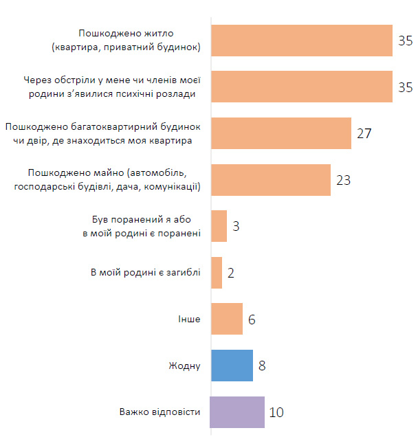 - Постійні обстріли Херсона військами рф призвели до значних матеріальних та людських втрат. Лише 8% херсонців зазначили, що вони не постраждали внаслідок ворожих обстрілів. Найбільш помітною є шкода, що завдана житлу та майну: у третини (35%) херсонців пошкоджено квартиру чи власний будинок, 27% зазначали, що пошкоджено їх багатоквартирний будинок, ще у 23% було пошкоджено майно (автівка, господарські споруди, комунікації, дачі тощо).