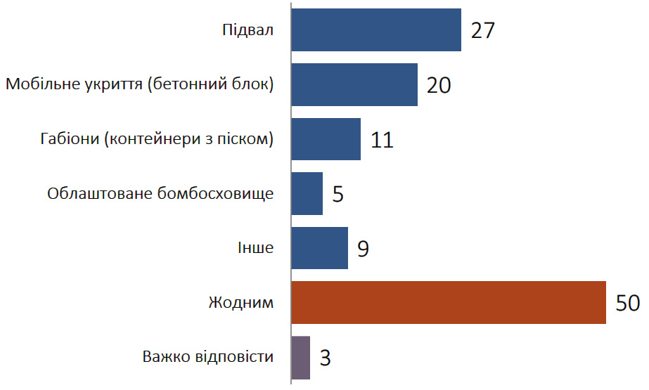 - Значна шкода також завдана здоров’ю херсонців: 35% засвідчує, що в їх родинах є люди, які почали страждати на психічні розлади, у 3% в родині є поранені. Але найстрашніше, що через обстріли міста гинуть люди. Під час опитування 2% херсонців засвідчили, що в їх родинах є загиблі. • Брак укриттів, значна їх віддаленість від місця проживання, їхня необлаштованість залишаються серйозною проблемою у місті. Тільки 10% містян мають поруч з місцем проживання облаштоване бомбосховище. Підвали та мобільні укриття залишаються найбільш доступними місцями схову. Причому щоб потрапити до них, часто треба подолати значну відстань, і не факт, що укриття буде відкрите.
