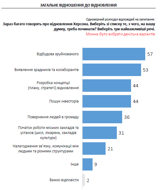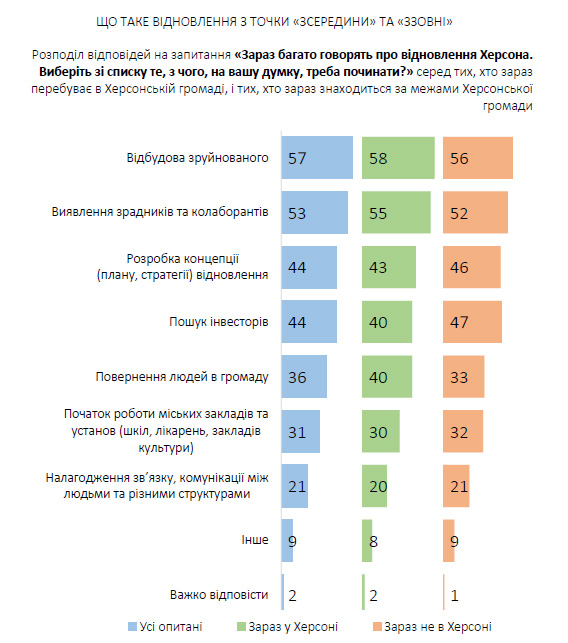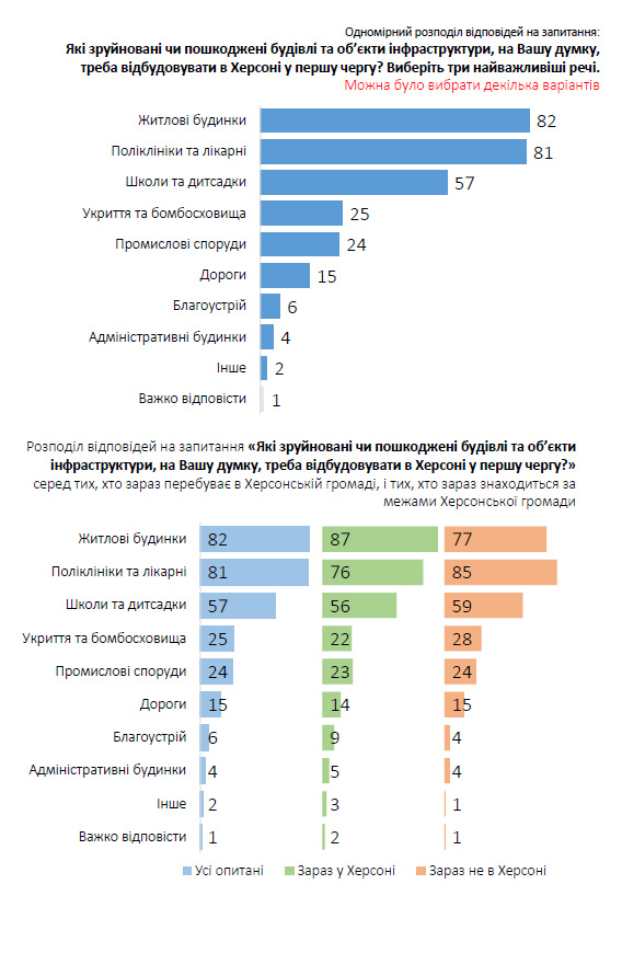 - Якщо говорити саме про відбудову, то тут серед пріоритетів (понад 80%) опинилися житловий фонд та об’єкти охорони здоров’я. При цьому для тих, хто зараз живе в Херсоні важливішою є відбудова житла (87%), а для тих, хто живе деінде – лікарні і поліклініки (85%).