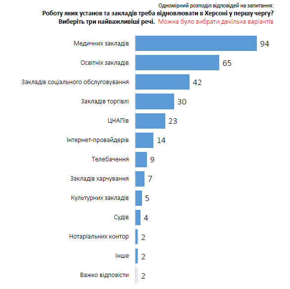 - Відновлення роботи медичних закладів є пріоритет №1 для всіх херсонців (94%), №2 – освітні заклади (65%), № 3 – заклади соцзахисту (42%).