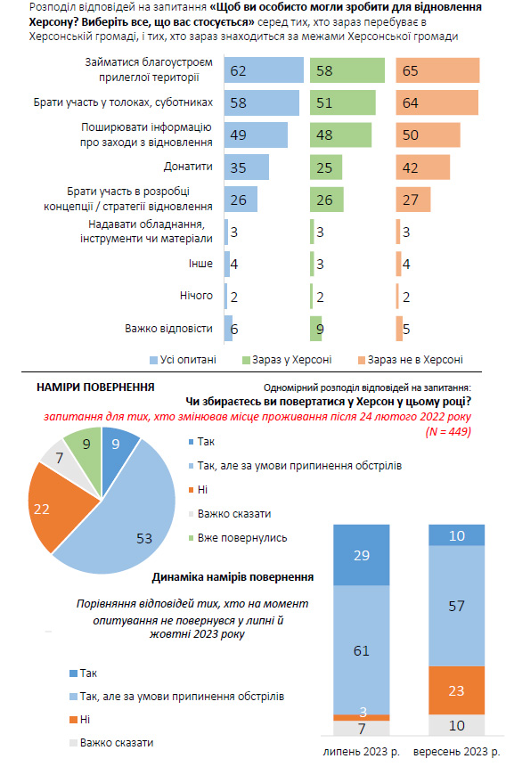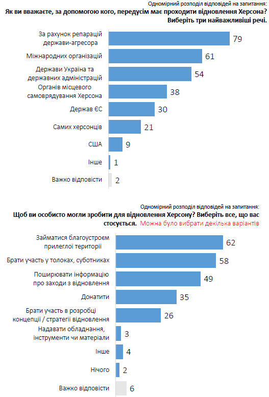 - Більшість херсонців готові особисто взяти учать у відновленні міста: 62% – кажуть, що готові займатися благоустроєм, 58% – брати участь у толоках, 49% – надавати інформаційну підтримку, 35% – донатити на відновлення.