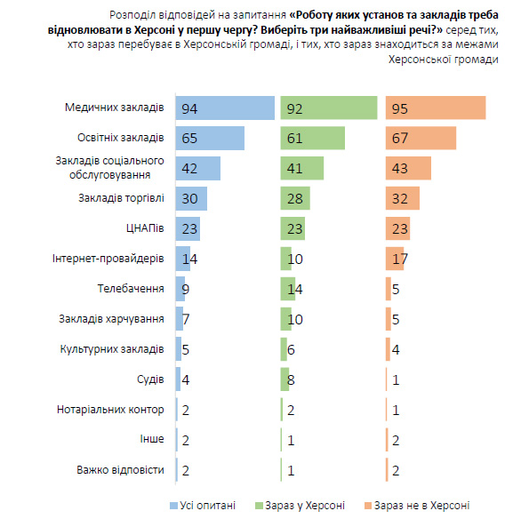 - Відновлення роботи медичних закладів є пріоритет №1 для всіх херсонців (94%), №2 – освітні заклади (65%), № 3 – заклади соцзахисту (42%).