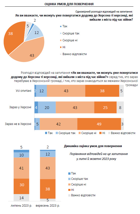 - Більше половини (62%), з тих, хто виїхав з Херсону збирається повернутися. З них більшість (53%) – за умови припинення обстрілів. І 82% вважає, що це зараз не на часі. В цих питаннях спостерігається негативна динаміка щодо частки тих, хто збирається повернутися (-23% сумарно «так» і «за умови припинення обстрілів») та позитивної оцінки умов повернення (-1 сумарно «так» і «скоріше так») порівняно з липнем 2023 року.