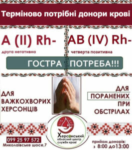 Кров різних груп і резус-факторів потрібна для людей, котрі постраждали від російських атак і для важкохворих херсонців.