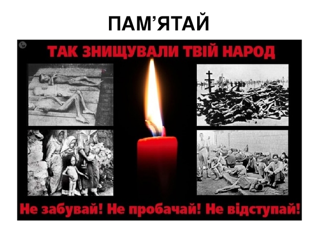 1998 року Указом Президента України встановлено День пам’яті жертв Голодомору – щороку в четверту суботу листопада. Цього дня українці, як тільки смеркне, запалюють у вікнах свічки – на пам’ять про всіх убитих голодом. 2006 року Верховна Рада України ухвалила Закон про визнання Голодомору геноцидом українського народу. А в листопаді 2008-го в Києві споруджено Національний меморіал жертв Голодомору.