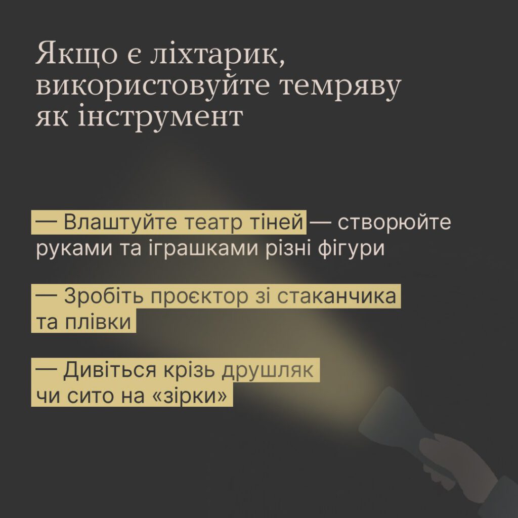 Періоди темряви через можливі відключення електроенергії буде легше пережити, якщо підготуватися до них заздалегідь. Окрім речей першої необхідності — ліхтариків, батарейок, теплого одягу — варто подбати про те, як допомогти дітям здолати тривожність та зробити час без світла комфортним і затишним, наскільки це можливо ?