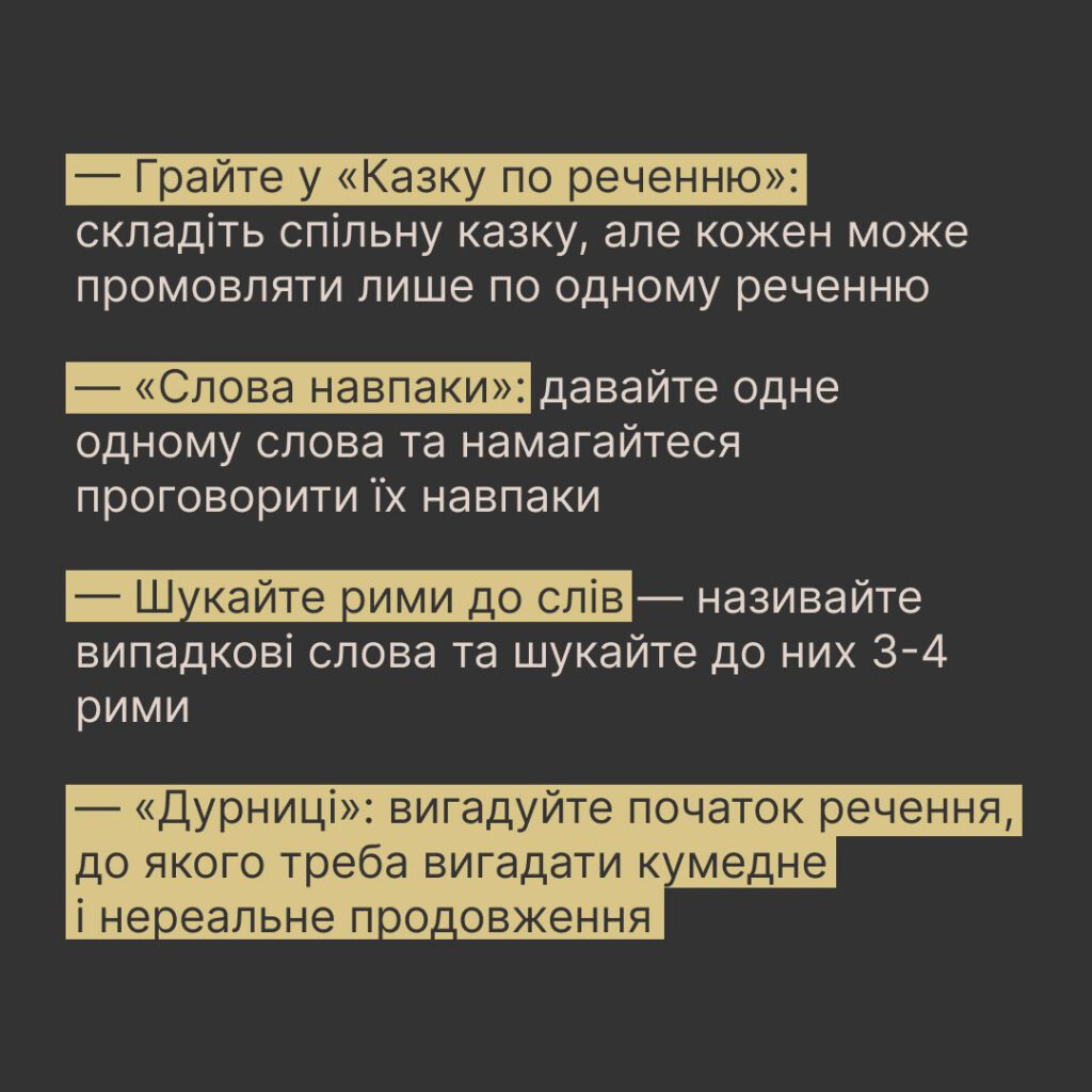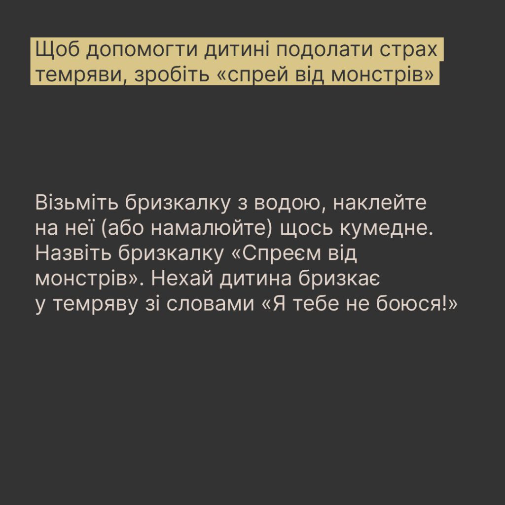 Контроль повертає відчуття впевненості. Домовтеся з дитиною, за що вона буде відповідати — вмикати ліхтарик, дбати про свою іграшку чи улюбленця. А щоб відволікти дитину, запропонуйте пограти в ігри. Гра — найпростіший спосіб трансформувати напругу.