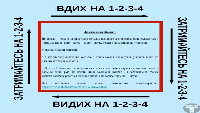 «Дихання по квадрату» — одна з найпоширеніших технік, яка допоможе опанувати емоції, знизити відчуття тривожності, наситить організм киснем. Вона не потребує особливих умов, тож виконати її можна будь-де: вдома, в машині, в школі чи в укритті.