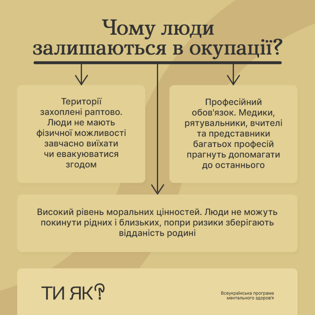 Певні території опинилися в раптовій окупації. У перші дні повномасштабного вторгнення люди просто не мали фізичної можливості завчасно виїхати чи згодом евакуюватися. У якийсь момент, протягом буквально одного дня, люди перейшли з одного статусу – вільного народу, громадян України – в статус мешканців окупованої території.