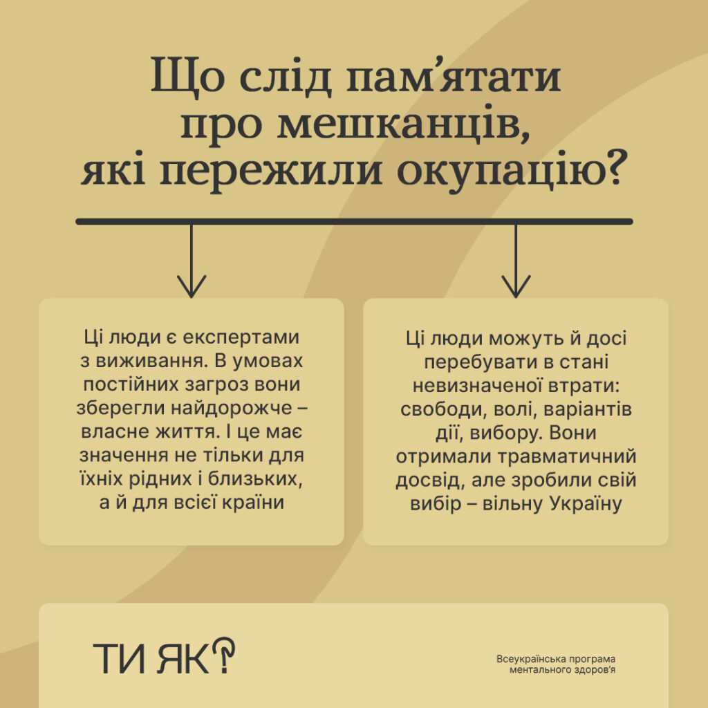 Після усвідомлення того, що для життя в окупації можуть бути різні форми мотивації, військова психологиня радить прийняти ще 2 фактори – саме на них фахівці базують спілкування з мешканцями деокупованих територій ![]()