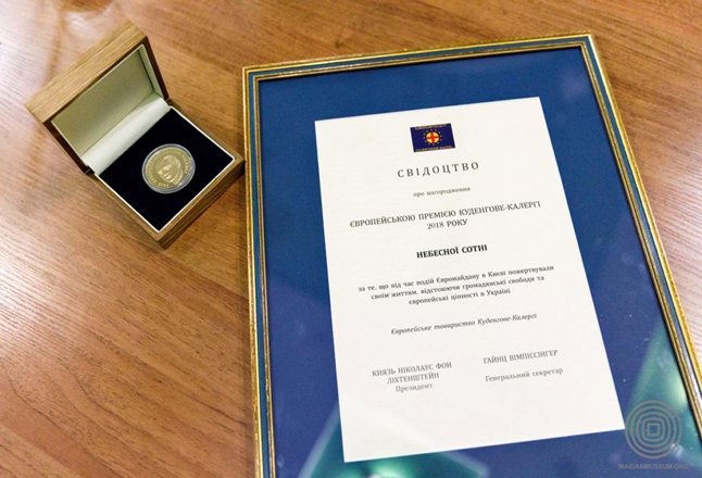 18 жовтня 2018 року Небесну Сотню символічно нагороджено премією Європейського товариства Куденгове-Калерґі. Цією відзнакою, заснованою 1978 року, нагороджують людей, діяльність яких спрямовано на підтримання миру та безпеки через об’єднання держав в Європі й установлення політичної рівноваги у світі. Серед нагороджених премією – Рональд Рейґан, Гельмут Коль, Анґела Меркель. 2018 року вперше в історії премію присудили не одній особі, а 107 загиблим, які під час подій Євромайдану в Києві пожертвували життям, обстоюючи громадянські свободи та європейські цінності в Україні.