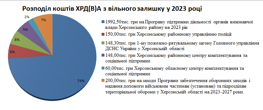 – 1992,5 тис. грн на Програму підтримки діяльності органів виконавчої влади Херсонського району на 2023 рік для забезпечення безперебійної роботи апарату районної державної (військової) адміністрації та її структурних підрозділів, які виконують делеговані та власні повноваження, знаходячись у зоні активних бойових дій (держава у I півріччі забезпечила фінансування на 35%);