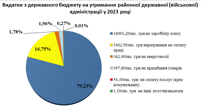 Видатки з державного бюджету на утримання районної державної (військової) адміністрації у 2023 році склали 20309,0 тис. грн. Із загальної суми видатки на заробітну плату склали 16091,2 тис. грн (79,23%); нарахування на оплату праці – 3402,5 тис. грн (16,75%); на енергоносії – 362,4 тис. грн (1,78%), в тому числі на водопостачання та водовідведення 2,1 тис. грн, електроенергія 181,6 тис. грн, природний газ 167,9 тис. грн, оплата інших енергоносіїв та інших комунальних послуг 10,9 тис. грн; на придбання товарів – 397,5 тис. грн (1,96%); на оплату послуг (крім комунальних) – 54,3 тис. грн (10,27%); на інші поточні видатки – 1,1 тис. грн (0,01%).