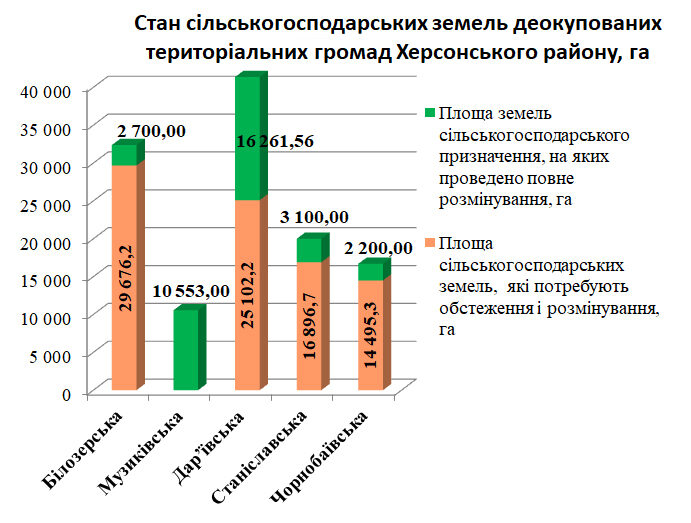 Загальна площа сільськогосподарських земель, які потребують обстеження і розмінування складає 120985 га (сільськогосподарські угіддя – 113679,3 га, несільськогосподарські угіддя – 7305,7 га), в тому числі по територіальним громадам: Білозерська – 32376,2 га, Музиківська – 10553 га, Дар’ївська – 41363,8 га, Станіславська – 19996,7 га, Чорнобаївська – 16695,3 га.