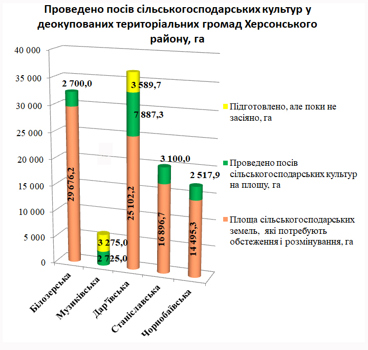 В період весняно-польових робіт по Херсонському району було проведено посів сільськогосподарських культур на площу 18930,2 га, в тому числі: по Білозерській територіальній громаді 2700 га, Дар’ївській територіальній громаді 7887,3 га, Музиківській територіальній громаді 2725 га, Станіславській територіальній громаді 3100 га, Чорнобаївській територіальній громаді 2517,9га.