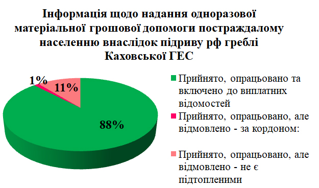У зв’язку із підривом окупаційними військами Каховської ГЕС з метою підтримки постраждалого населення постановою Кабінету Міністрів України від 19 червня 2023 року № 626 затверджено Порядок надання одноразової матеріальної грошової допомоги постраждалому населенню внаслідок підриву Російською Федерацією греблі Каховської гідроелектростанції відповідно, якого спеціалістами управління прийнято та опрацьовано 4522 пакети документів. З них 3975 включено до виплатних відомостей для виплати грошової допомоги з резервного фонду державного бюджету у розмірі 5000, 00 грн на особу, 547 осіб відмовлено (54 чол. – за кордоном, 493 чол. – не є підтопленими).