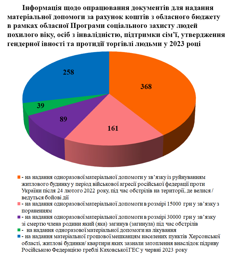 З метою надання матеріальної допомоги за рахунок коштів з обласного бюджету в рамках обласної програми соціального захисту людей похилого віку, осіб з інвалідністю, підтримки сім’ї, утвердження гендерної рівності та протидії торгівлі людьми на 2020-2024 роки проводилася робота із мешканцями громад, які перебувають у складних життєвих обставинах щодо формування необхідних документів. Опрацьовано та направлено 915 пакетів документів осіб для розгляду на обласній комісії а саме: 368 пакетів документів на надання одноразової матеріальної допомоги у зв’язку із руйнуванням житлового будинку у період військової агресії російської федерації проти України після 24 лютого 2022 року, під час обстрілів на території, де велися / ведуться бойові дії; 161 пакет документів на надання одноразової матеріальної допомоги в розмірі 15000 грн (п’ятнадцять тис. грн) у зв’язку з пораненням; 89 пакети документів на надання одноразової матеріальної допомоги в розмірі 30000 грн (тридцять тис. грн) у зв’язку зі смертю члена родини який (яка) загинув (загинула) під час обстрілів та 39 пакетів документів на надання одноразової матеріальної допомоги на лікування, спеціалістами прийнято та направлено 258 пакетів документів осіб для розгляду на обласній комісії з метою надання матеріальної грошової мешканцям населених пунктів Херсонської області, житлові будинки/ квартири яких зазнали затоплення внаслідок підриву Російською Федерацією греблі Каховської ГЕС у червні 2023 року.