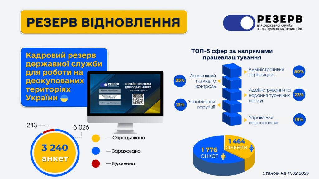 В електронній системі Резерву відновлення зареєстровано 3240 анкет, зокрема: 3026 – зараховано; 213 – відхилено; 1776 анкет подали чоловіки; 1464 анкети подали жінки.