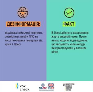 У соцмережах з’явилися повідомлення, що в Україні незабаром почнеться спалах холери, і поширювали фейк, ніби введення електронних медичних карток небезпечне для українців. У російському міноборони заявили, що українські військові планують розмістити засоби ППО на місці поховання померлих від чуми в Одесі.